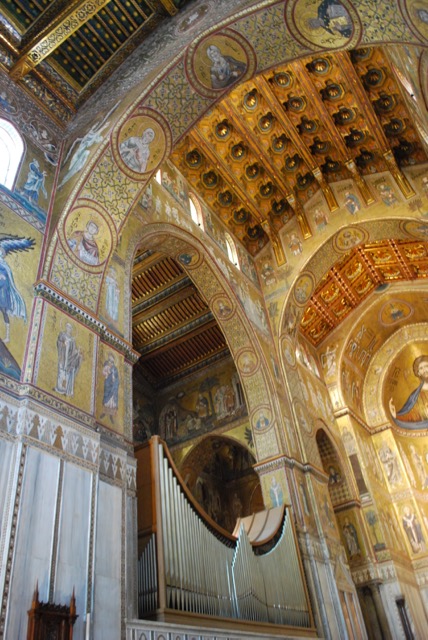 Tatsächlich, der im 13. Jahrhundert fertig erstellte Innenbereich ist überwältigend. Im Hauptgewölbe erhebt sich ein riesiges Mosaikbildnis (7m hoch und 13.30 m breit), welches Christus als Weltenherrscher (Pantokrator = Allmächtig) darstellt. Darunter befindet ein weiteres riesiges Bildnis der Santa Maria Nuova mit dem segnenden Jesuskind, sowie vor dem Altar die Statue der ursprünglich aus Konstantinopel stammende Madonna Hodegetria. Bereits im Jahre 1182 weihte Papst Lucius III zu Ehren der Heiligen Mutter Gottes, die Kirche auf den Namen Santa Maria Nuova ein.